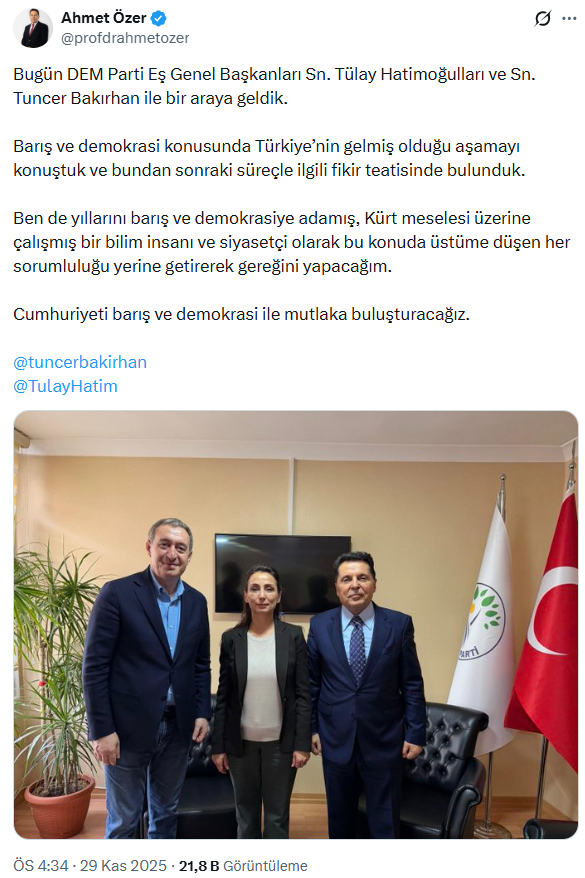 Ahmet Özer, sosyal medya paylaşımında DEM Parti yetkilileriyle görüştüğünü duyurdu.