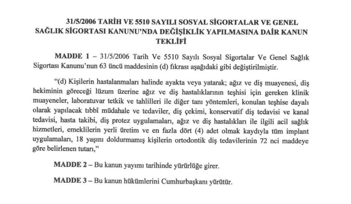 MHP Kayseri Milletvekili İsmail Özdemir’in sunduğu teklifle yerli üretim olmak şartı ile ve 4 adetten fazla olmamak üzere implant tedavilerinin SSK kapsamına alınması önerildi.